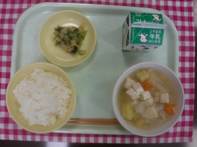 今日の献立は、ご飯、牛乳、白菜ひたし、さつま汁です。