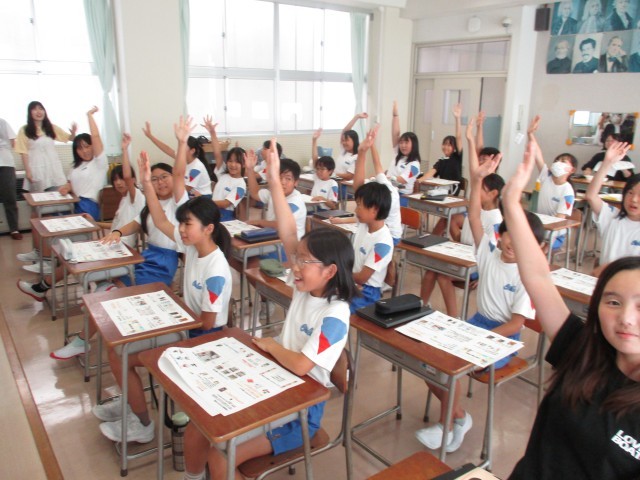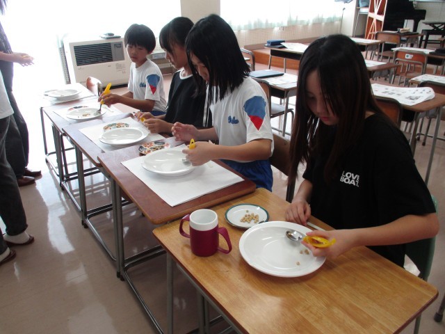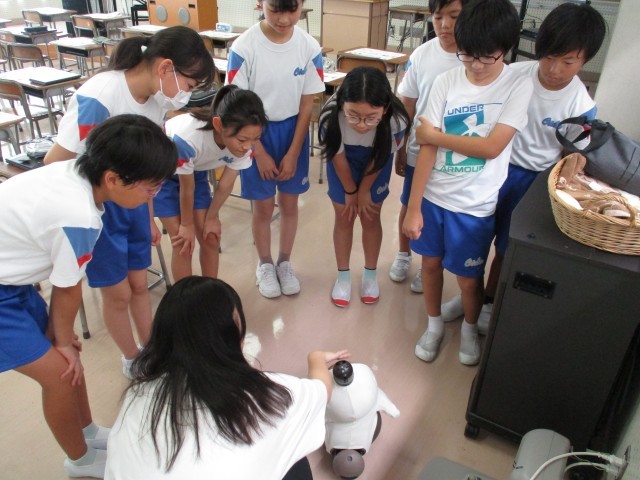 今日は富山短期大学の学生さんが来られて、介護の話を聞かせてくださったり、体験をさせてくださったりしました。介護ロボットを実際に触ってみたり、介護用の食器を使って豆つかみをしたり、車いすにのったりとたくさんの体験ができました。最後には「楽しかった人?」と聞かれ、みんな「楽しかった!」と応えていました。子供たちにもたくさんの学びがあったようです。