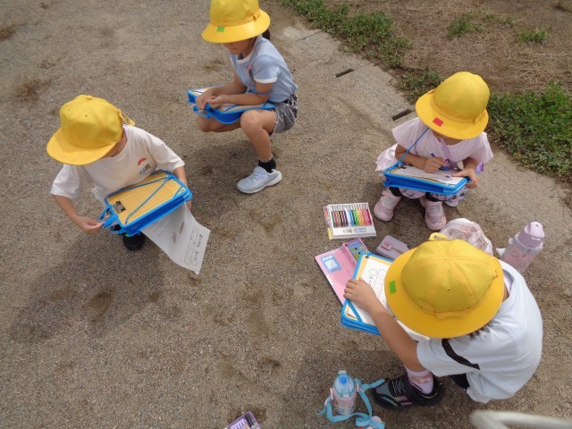 コオロギやトンボといった、秋らしいむしが見つかり、プリントに記録していました。