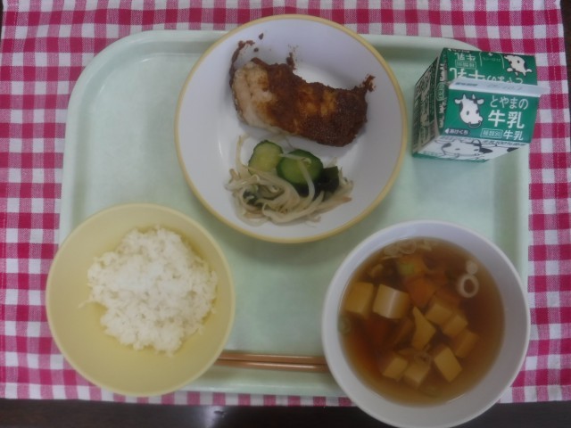 9月24日(水)今日の給食 公開日 2025/09/24 更新日 2025/09/24 本日の給食 今日の献立は、ご飯、牛乳、ホキの甘みそかけ、甘酢和え、すまし汁です。ごまだれのきいた甘みそをからめていただくホキは、大変おいしく、ご飯が進みます。