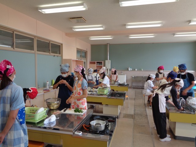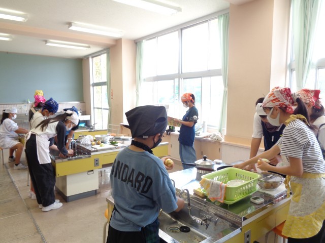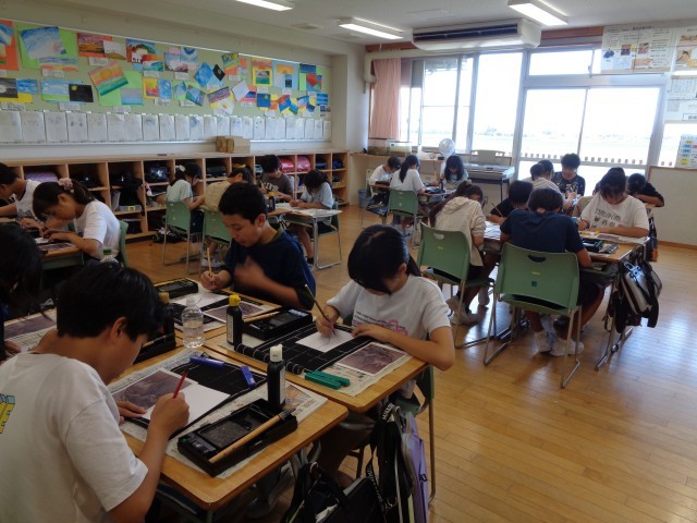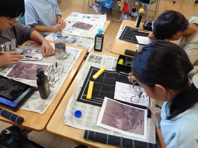 家庭科の学習では、班のみんなでベーコンポテトを作りました。火が通りやすいように薄く切ることを意識していました。社会科の学習は、雪舟になりきってすみ絵を描きました。墨と水で濃淡をつけて本物そっくりに描こうと頑張っていました。