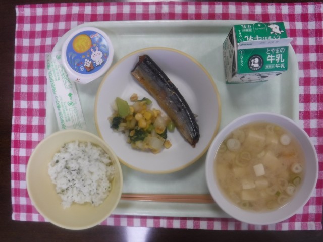 10月2日(木)今日の給食 公開日 2025/10/02 更新日 2025/10/02 本日の給食 今日の献立は、菜めし、牛乳、さんまのマーマレード煮、コーン和え、団子汁、お月見ゼリーです。お月見献立です。まるい白玉団子、コーンの黄色から満月をイメージできます。
