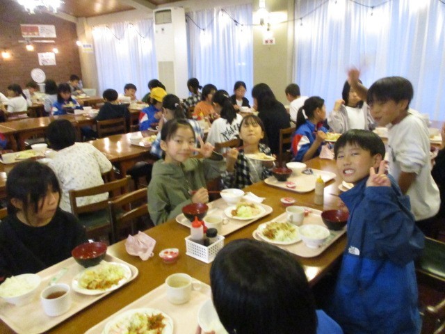 夕食はレストランでみんなで楽しく食べました。その後のお風呂も大きな浴場に歓声をあげ、みんなで仲良く入っていました。