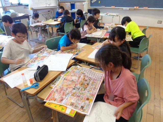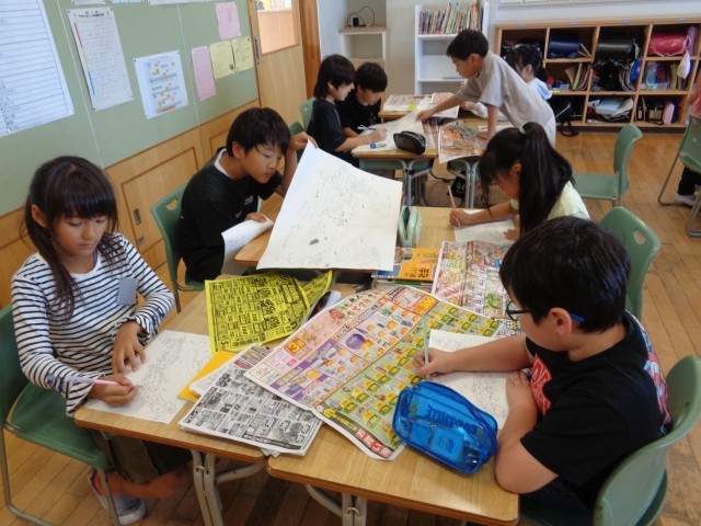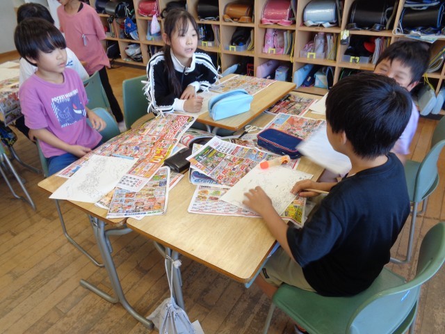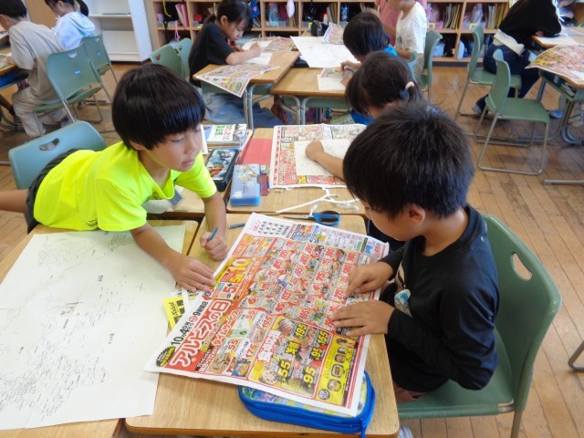 社会科では、スーパーに並ぶ品物がどこから届いているか、チラシを使って調べました。全国各地だけでなく、海外からも届いていることに気付いた子供たち。買い物に来るお客さんのことを考え、たくさんの商品が並べられていることに目を向けていました。