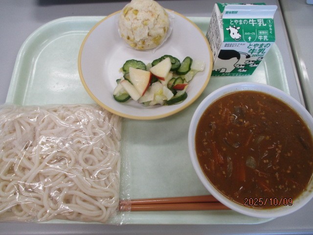 10月9日(木)今日の給食 公開日 2025/10/09 更新日 2025/10/09 本日の給食 今日の献立は、ソフト麵、カレーソース、蒸しパン、白菜とりんごのサラダ、牛乳でした。 今日のメニューを楽しみにしていたという声を多く聞きました。カレーソースとなじませながらおいしくいただきました。
