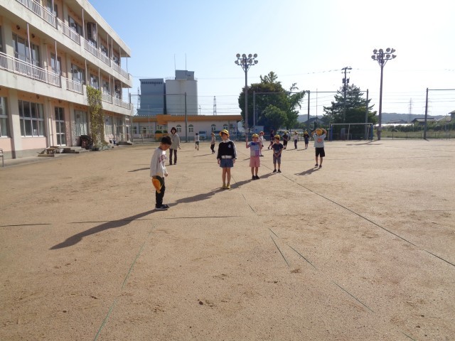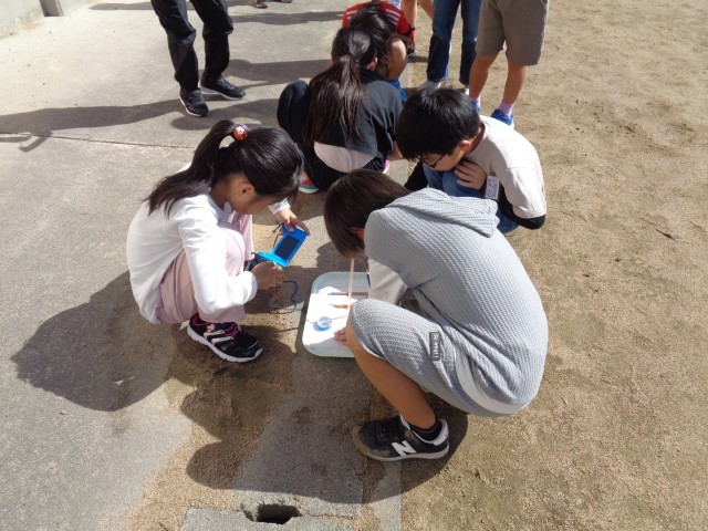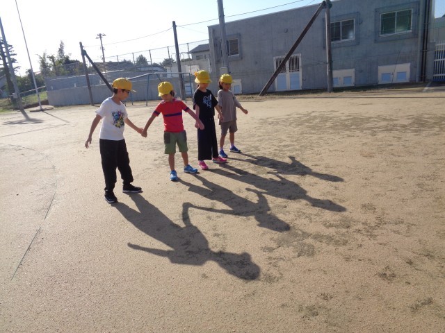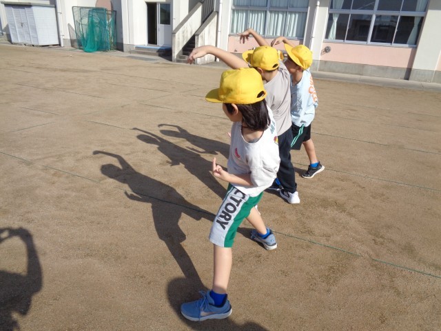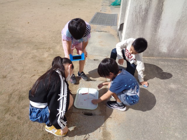 理科では、「太陽とかげ」の学習に入りました。「かげたんけんツアー」と題し、かげ送りやかげつなぎ、太陽とかげの関係調べなどのミッションにチャレンジしました。また、かげの向きや太陽の位置の変化も観察しました。