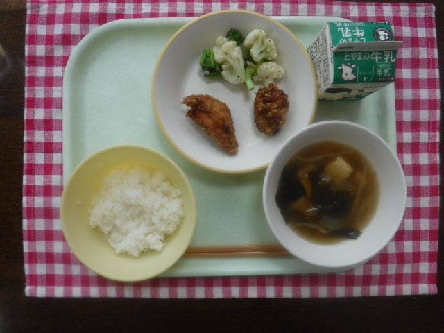 10月23日(木)今日の給食 公開日 2025/10/23 更新日 2025/10/23 本日の給食 今日の献立は、ご飯、牛乳、鶏肉のごま揚げ、花野菜サラダ、わかめスープです。緑色のブロッコリーと白いカリフラワーでいろどりよく、栄養もあるサラダです。