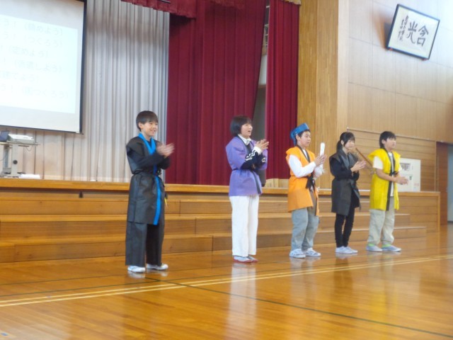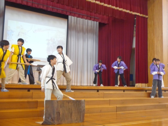 歴史をテーマにした劇を行いました。自分たちで必要な道具を作ったり、当時を想像させる歌詞をつくったりと、23人で協力してつくりあげてきました。動きを付けたり言葉に抑揚をつけたりしながら登場人物になりきり、迫力ある劇に仕上がりました。