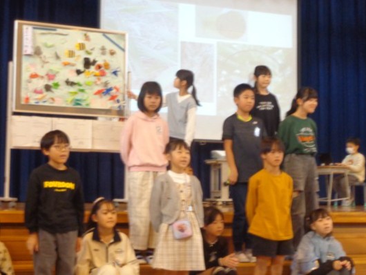 10月26日(日)4年生 学習発表会「すてきな自然博物館in老田」 公開日 2025/10/27 更新日 2025/10/27 4年生 4年生は総合的な学習の時間に「地球にやさしい みんなにやさしいプロジェクト」というテーマで自然環境について調べています。自分たちの住む老田地区についても調べ、分かったことを学習発表会で伝えました。自然が豊かで、すてきなところがたくさんあることを発見し、そんな老田を守ってくださっている地域の方々に感謝の気持ちを伝えることができました。。
