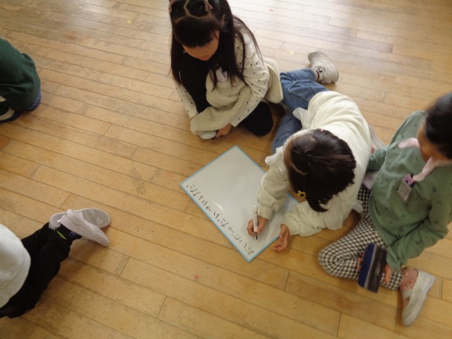 池多小学校、古沢小学校の1年生としりとりゲームをして交流しました。お題の言葉にできるだけ少ない言葉の数でたどり着くために、協力して考えていました。