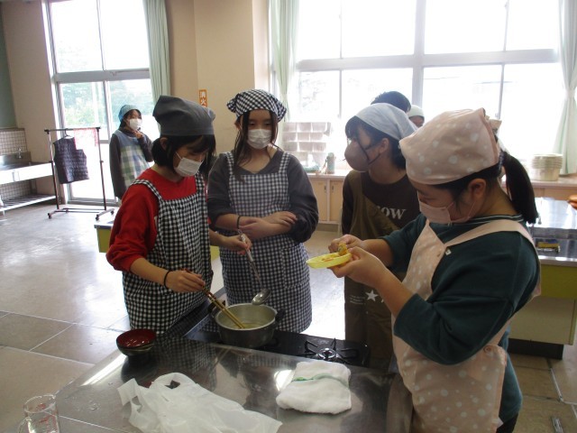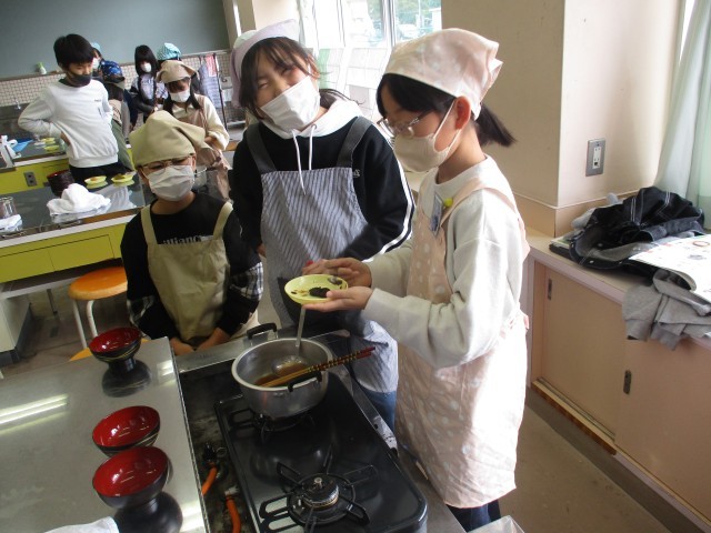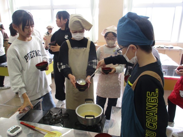 今日の家庭科では、おいしい味噌汁をつくるために実験をしました。4種類の出汁と2種類の味噌を使い、どの組み合わせの味噌汁がおいしいかみんなで飲み比べました。「にぼしと白みそがいい!」と言う子もいれば、「鰹節と赤みそがよかった」という子もおり、好みはそれぞれでした。次回の調理実習では、具材も入れて、自分たちの好みにあった味噌汁をつくり、自分たちで収穫した学校米を炊いて実食する予定です。