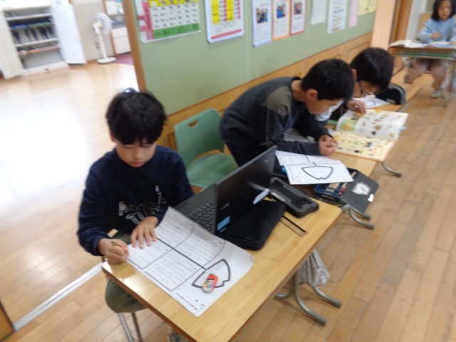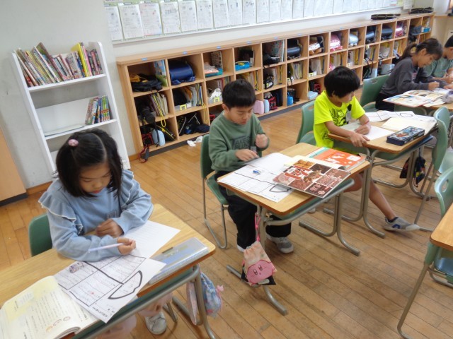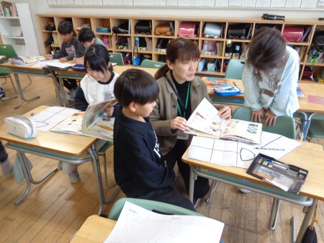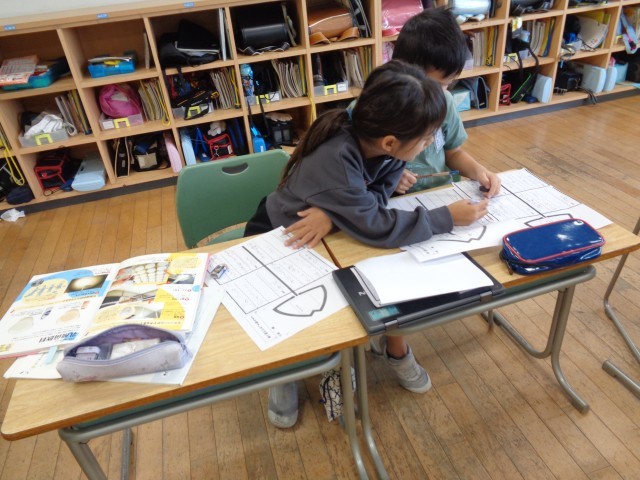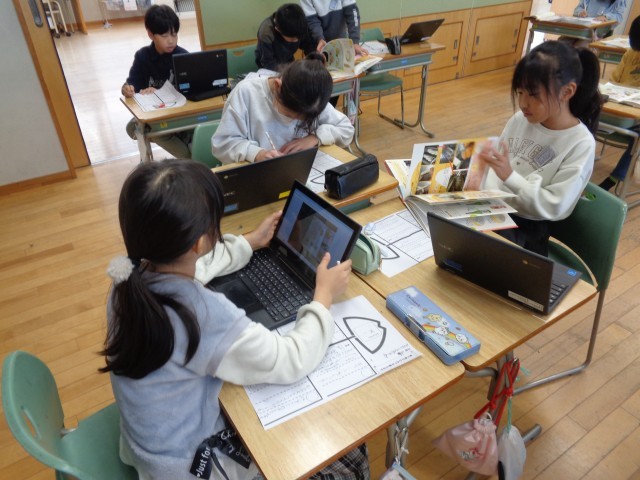 国語科「食べ物のひみつを教えます」の授業では、知らせたい材料を一つ選び、おいしく食べる工夫や食品をフィッシュボーンにまとめています。「すがたをかえる大豆」で学んだことを生かし、読む人が分かりやすい文章を目指します。