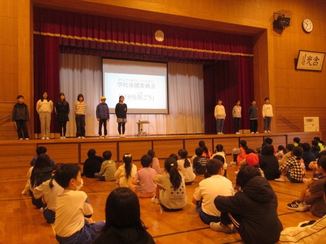 11月18日(火)に学校保健委員会が開かれました。今年のテーマは「けがを防ごう」です。全校のみんなが自分事として考えられるように、内容や伝え方を環境保健委員会が考えて発表しました。仲良し班で、けがの原因やけがを防ぐ方法を考える場面もあり、けがなく楽しい学校生活が送ることができるように意識を高めました。