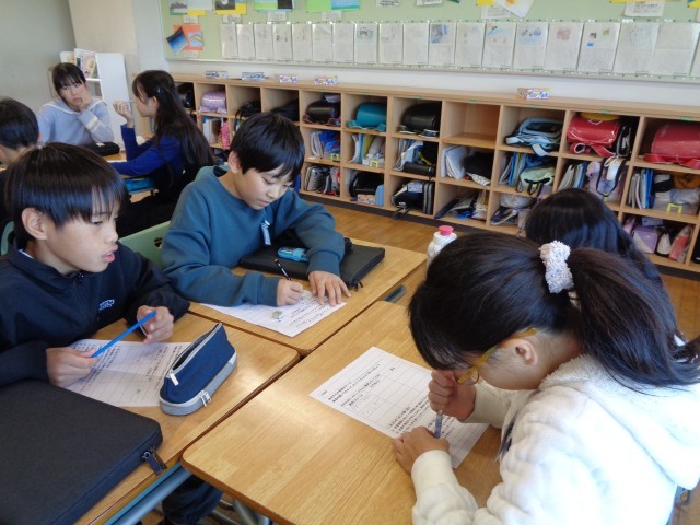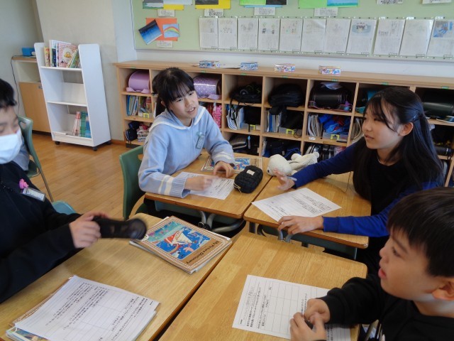 来月老田小学校に、カナダからいらっしゃったガラス作家さん来校されます。「富山すてきなところをたくさん知ってほしい」と考え、富山県ならではの食べ物や観光地、ゆるキャラなどを発表することにしました。今まで習った英語を使いながら発表の準備を進めています。