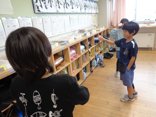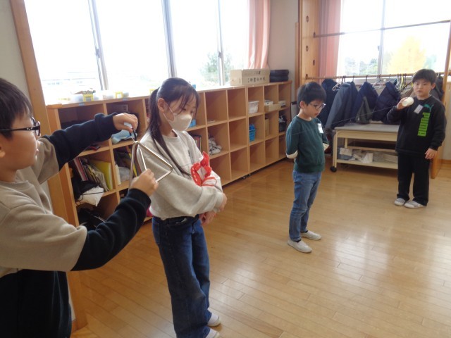 理科「音のせいしつ」の学習では、音が伝わるとき、音を伝える物は震えているのかを調べました。紙コップから聞こえてくる音に耳を澄ましたり、糸の様子をじっと観察したりして確かめていました。