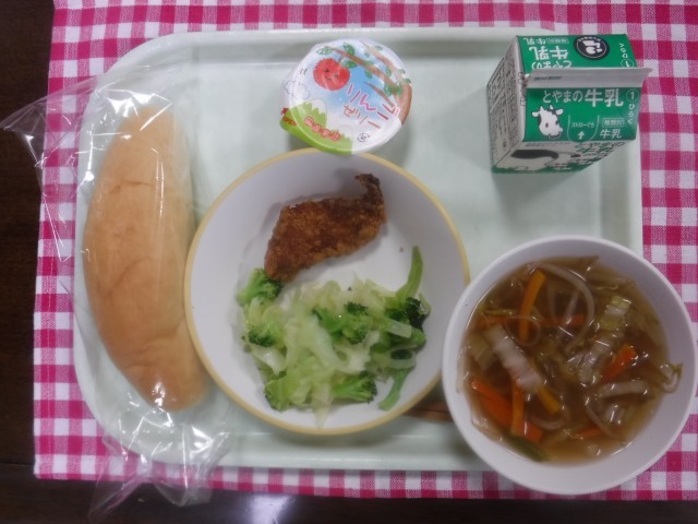 右の写真は主菜が豚肉の香り揚げ、デザートはリンゴゼリーです。