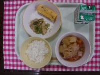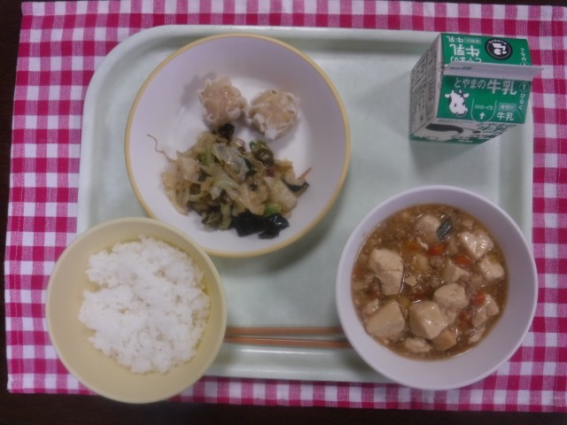 今日の献立は、ご飯、牛乳、コーンシュウマイ、海藻サラダ、マーボー豆腐です。