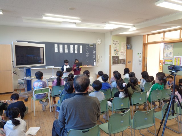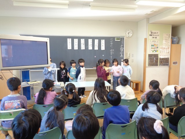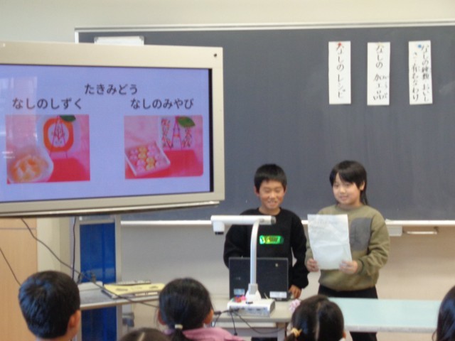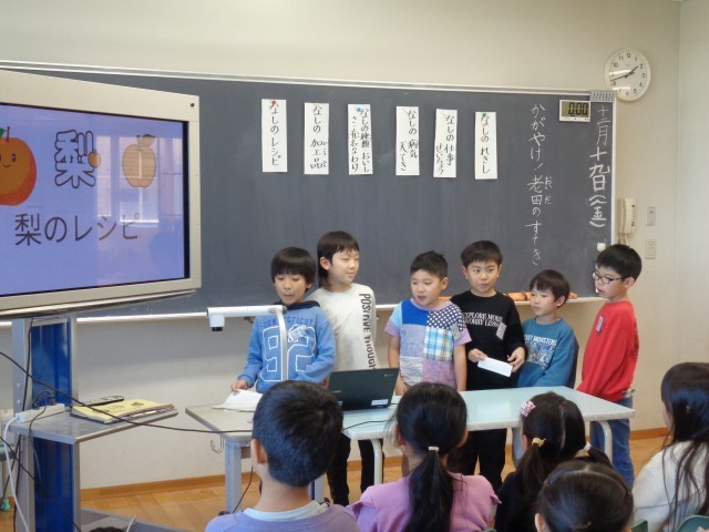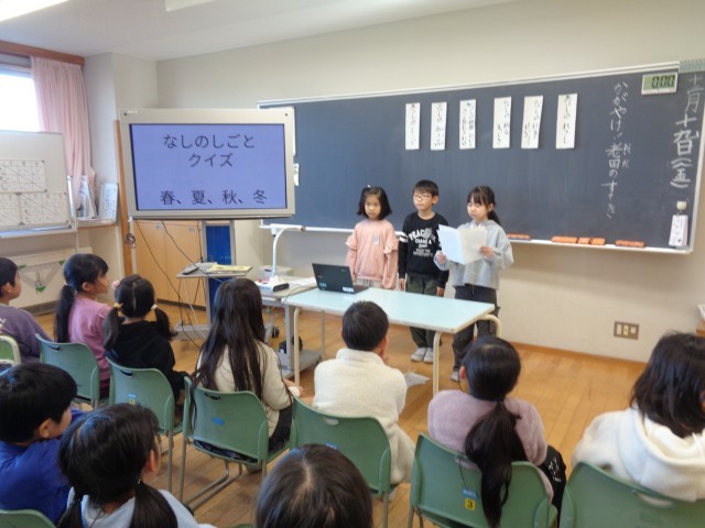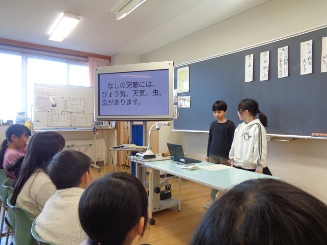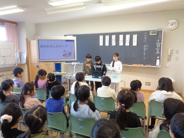 総合「かがやけ!老田のすてき!」では、老田梨が「老田のすてき」であると考え、学習を進めてきました。今回は、クイズやペープサート、劇、スライド等、自分たちの伝えたいことに合わせて発表方法も工夫し、2年生や梨農家の方に発表しました。練習の成果を発揮し、堂々と発表する姿が輝いていた3年生でした。