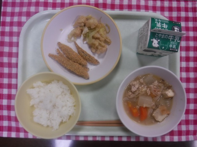 献立は、ご飯、牛乳、きびなごのさくさく揚げ、レモン和え、厚揚げの中華煮込みです。