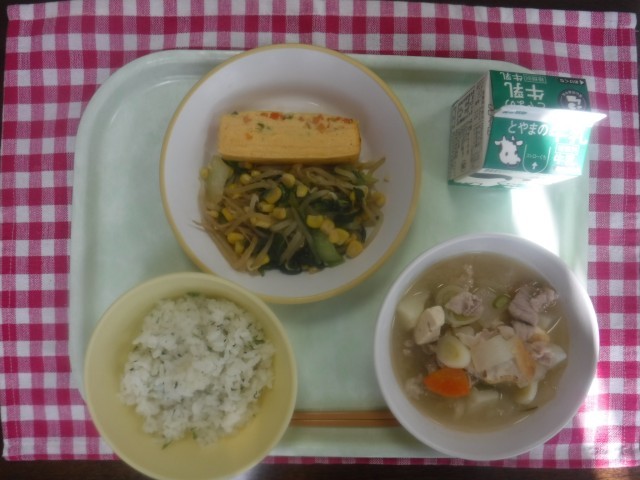 1月16日(金)今日の給食 公開日 2026/01/16 更新日 2026/01/16 本日の給食 今日の献立は、菜飯、牛乳、千草焼き、チンゲンサイソテー、豚汁です。一足早い「春色」の献立です。黄、緑、オレンジ等のいろどりがきれいです。