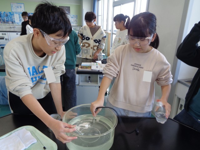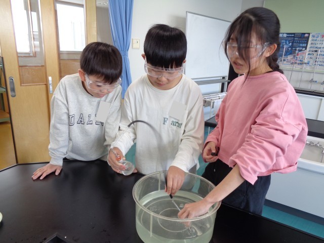 1月23日(金) 6年生理科 水溶液の性質 公開日 2026/01/23 更新日 2026/01/23 6年生 理科では、5つの水溶液の性質について学習しています。今日は炭酸水の泡は何なのかを調べるために、水上置換法を用いて、気体を集めました。