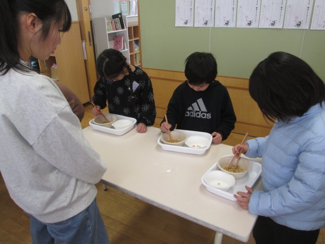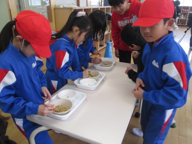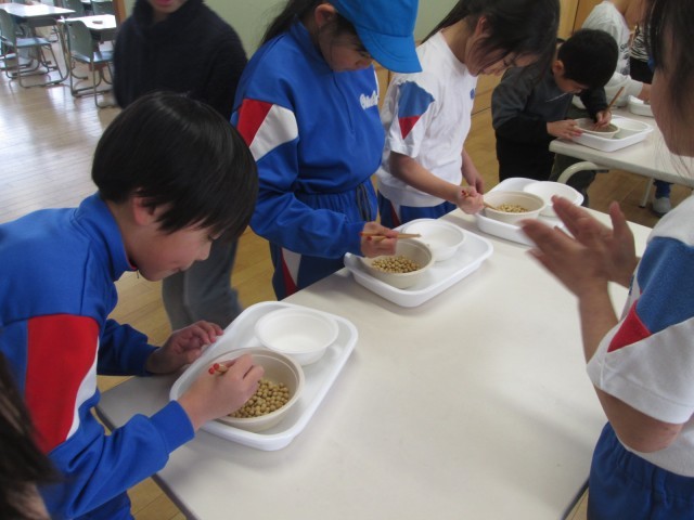 今週は給食週間で、給食委員会がいろいろなイベントを企画しています。今日は、1,2年生が豆つまみゲームをしました。1分間集中して豆つまみに取り組んでいました。