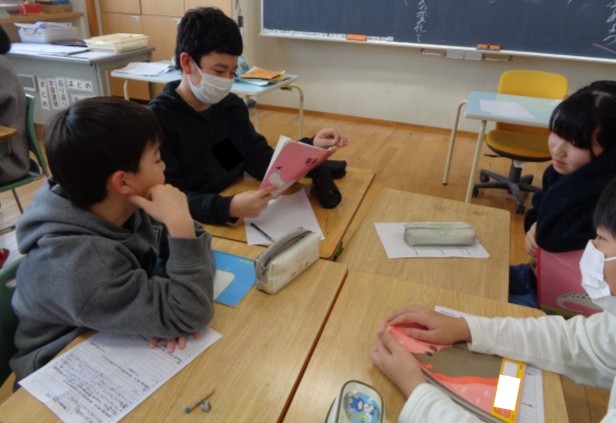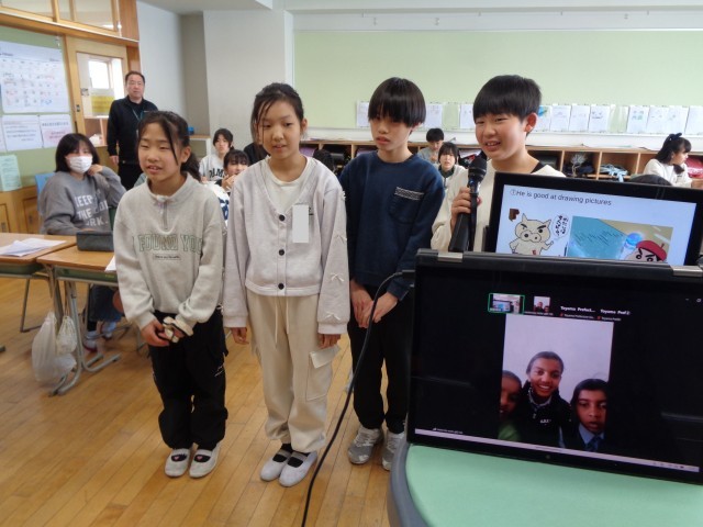 国語科の学習では、互いの「考えるとは」についての考えを聴き合い、自分の考えと比べました。外国語科では、インドの学校とZoomでつながり、日本のアニメキャラクターについて発表をするなど、交流しました。