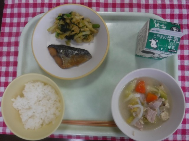 今日の献立は、ご飯、牛乳、さばのみそ煮、おひたし、塩こうじ鍋です。