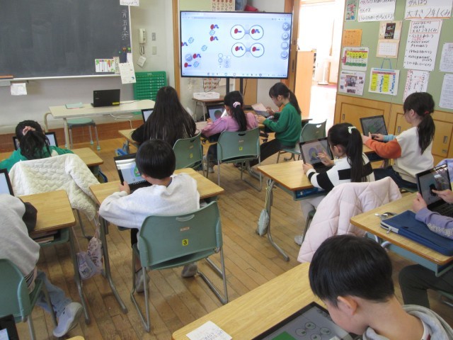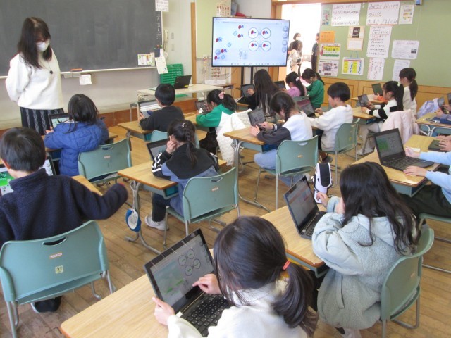 講師の先生に来ていただきプログラミング教室を行いました。前回は、描いた絵を左右や上下に動かす方法を習いました。今回は、生き物の動きを表しました。子供たちの発想は豊かで、楽しい動きがたくさんできました。また、友達と見せ合って、お互いのよさや面白さを楽しみました。