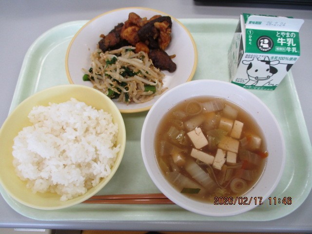 2月17日(火)今日の給食 公開日 2026/02/17 更新日 2026/02/17 本日の給食 今日の給食は、ごはん、中華スープ、鶏肉とレバーのカレー風味、ナムル、牛乳でした。 レバーが苦手な子どもたちもいますが、カレー風味にすると、とても食べやすいようです。ごはんがよく進む一品でした。