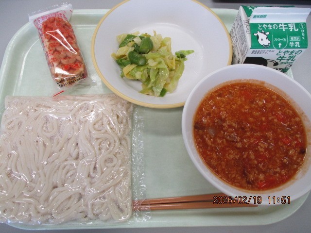 2月19日(木)今日の給食 公開日 2026/02/19 更新日 2026/02/19 本日の給食 今日の給食は、ソフト麵、ミートソース、アスパラサラダ、チーズドック、牛乳でした。 今日のミートソースには、レンズ豆が入っていました。レンズ豆には体の調子を整えるビタミンや、お腹の掃除をしてくれる食物繊維がたくさん含まれています。