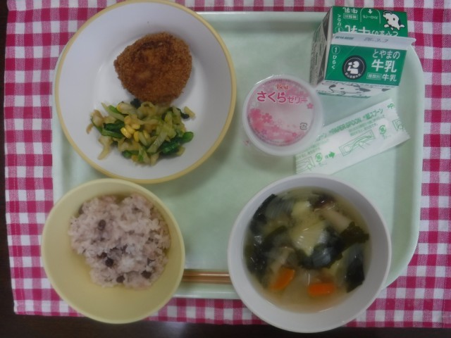 2月24日(火)今日の給食 公開日 2026/02/25 更新日 2026/02/25 本日の給食 一足早く、卒業祝い献立です。赤飯、牛乳、とんかつ、コーン和え、みそ汁、お祝いゼリーです。卒業式まで、あと半月、一日一日を大切に過ごしたいです。