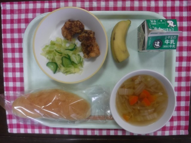 今日の献立は、コッペパン、牛乳、鶏肉の塩こうじ揚げ、そえ野菜、ひよこ豆のスープ、バナナです。