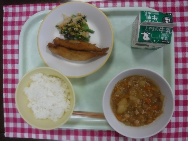 今日の献立は、ご飯、牛乳、ししゃもフライ、いり大豆あえ、じゃがいものそぼろ煮です。