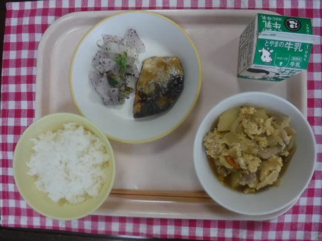 今日の献立は、ご飯、牛乳、さばのみそ煮、ゆかり和え、親子煮です。