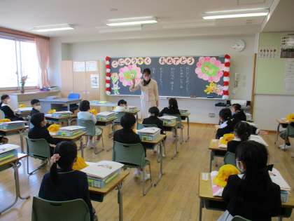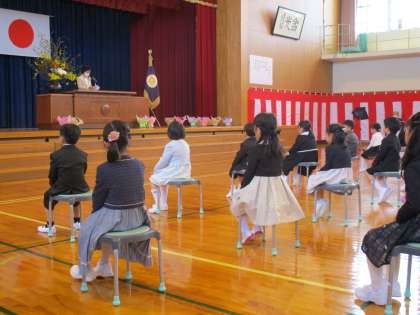 ピカピカのランドセルを背負って老田小学校へやってきた新入生の28名はどの児童も期待に満ちた表情をしていました。入学式が始まる前は少し緊張した面持ちをしながらも、堂々とした態度で式を終えました。
