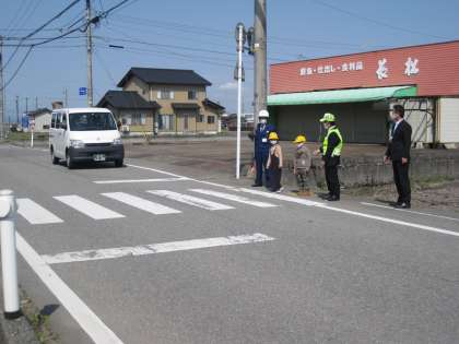 まず、体育館で、道路の安全な歩き方をビデオで学んだ後、実際に学校前2カ所の横断歩道を渡ったり、歩道や路側帯の歩き方の練習をしました。