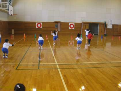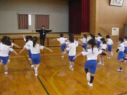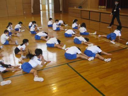 入学して初めての体育。並び方の練習をしたり、ストレッチや、様々な体の動かし方の運動に取り組んだりと、楽しみながら体を動かしていました。