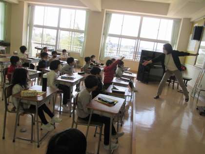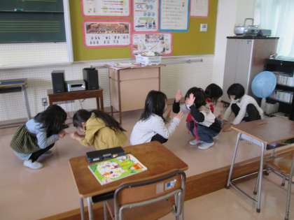 音楽の先生と一緒に身体を動かしながら、音楽遊びを楽しみました。曲のテンポが速くなったり遅くなったりするのに合わせて、歌や動きを速くしたり遅くしたりしました。