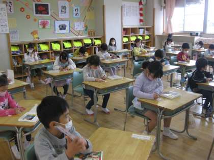 4月13日(火)1年 国語 公開日 2021/04/13 更新日 2021/04/13 1年生 今日の国語の学習では教科書の文に合う振り付けを考えて、実際に体を動かしながら読みました。 また、鉛筆の持ち方や字を書くときの姿勢の勉強もしました。まだ長い鉛筆を小さな手でしっかりと持ち、集中して取り組んでいました。