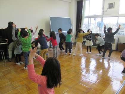 ピアノのリズムに合わせて、「ロンドンばし」の遊びをしました。身体を動かしながら歌い、全身で音楽遊びを楽しみました。