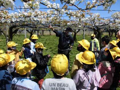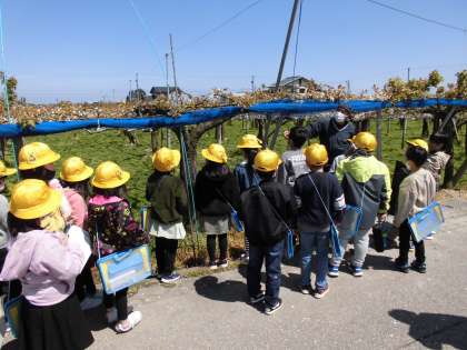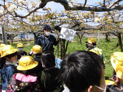 今日は3、4限の総合的な学習の時間に梨園に行き、様々なお話を聞きました。子供たちは梨作りのお話を興味津々の様子で聞いていました。