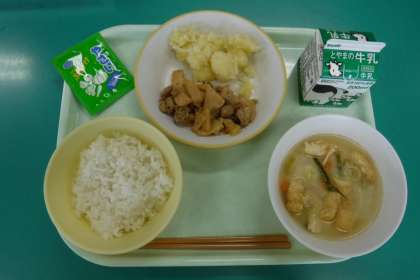 4月16日(金) 本日の給食 公開日 2021/04/17 更新日 2021/04/17 今日のひとコマ 今日の献立は、 ・ご飯 ・牛乳 ・鶏肉の梅肉和え ・粉ふきいも ・呉汁 ・野菜ふりかけ です。 鶏肉の梅肉和えは、食べやすく、子供たちに人気でした。