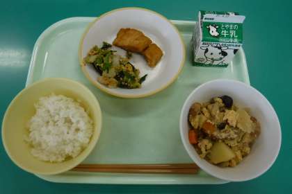 4月20日(火) 本日の給食 公開日 2021/04/21 更新日 2021/04/21 今日のひとコマ 今日の献立は、 ・ご飯 ・牛乳 ・揚げ魚のレモン味 ・入り大豆和え ・油麩の卵とじ です。 細かく刻んだ大豆が、よいアクセントになっていました。