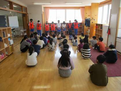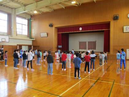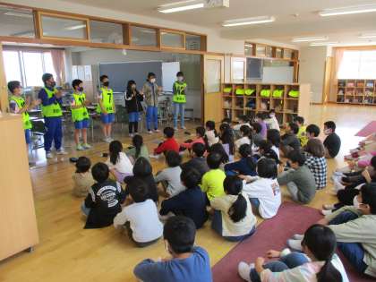 色団顔合わせ会では、団長、副団長、応援団長の紹介や応援合戦の練習を行いました。6年生の子供たちは、下級生の前で堂々と説明したり、大きな声でかけ声を出したりするなど運動会に向けて練習しました。