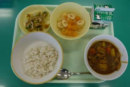 ・カレーライス(麦ご飯) ・牛乳 ・福神和え ・フルーツポンチ です。
