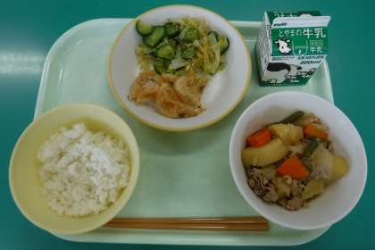 ・ご飯 ・牛乳 ・白エビの米粉揚げ ・合わせ和え ・肉じゃが です。