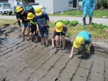 始めは機械で植える様子を見学しました。その後、転がしを使って跡を付けたところに、一人一人が苗を手で植えました。裸足で田の中に入ったときは、いろいろな声が出ましたが、手植えを始めると、どの子も真剣でした。
