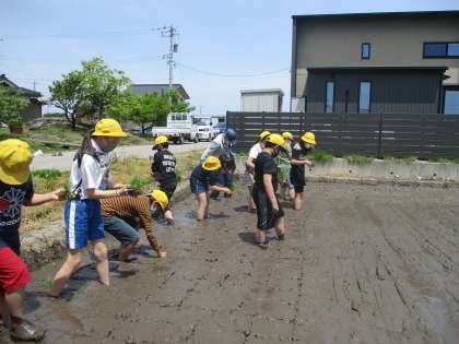 教育後援会やかじうらファームの皆さんのご協力を得て、学校田で田植えを体験しました。