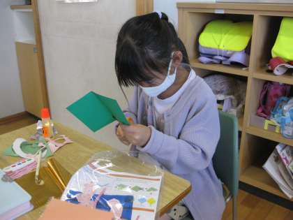 折ったり重ねたりした折り紙をはさみで切ってかざりを作りました。折り紙を開くと出てくる様々な模様に「ふしぎだな」「すごくきれい」と目を輝かせて活動に取り組んでいました。